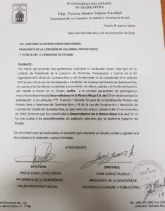 Chetumal.- Dos integrantes de la Decimoquinta Legislatura presentaron un oficio ante la Oficialía de Partes del Congreso del estado, para solicitar que la Comisión de Hacienda Presupuesto y Cuenta realice una auditoría a la paraestatal Desarrolladora de la Riviera Maya.