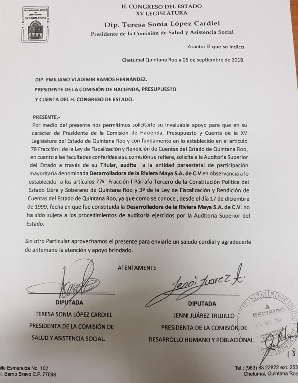 Chetumal.- Dos integrantes de la Decimoquinta Legislatura presentaron un oficio ante la Oficialía de Partes del Congreso del estado, para solicitar que la Comisión de Hacienda Presupuesto y Cuenta realice una auditoría a la paraestatal Desarrolladora de la Riviera Maya.