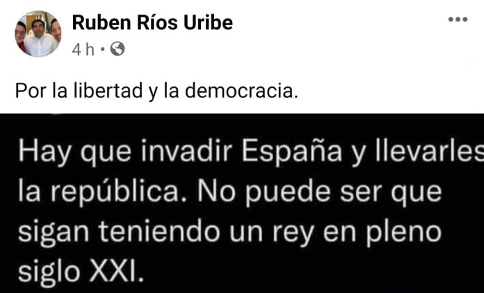 Sin especificar si es una broma, el Diputado Rubén Ríos Uribe, posteó en sus redes sociales “Hay que invadir España y llevarles la república. No puede ser que sigan teniendo un Rey en pleno siglo XXI”.