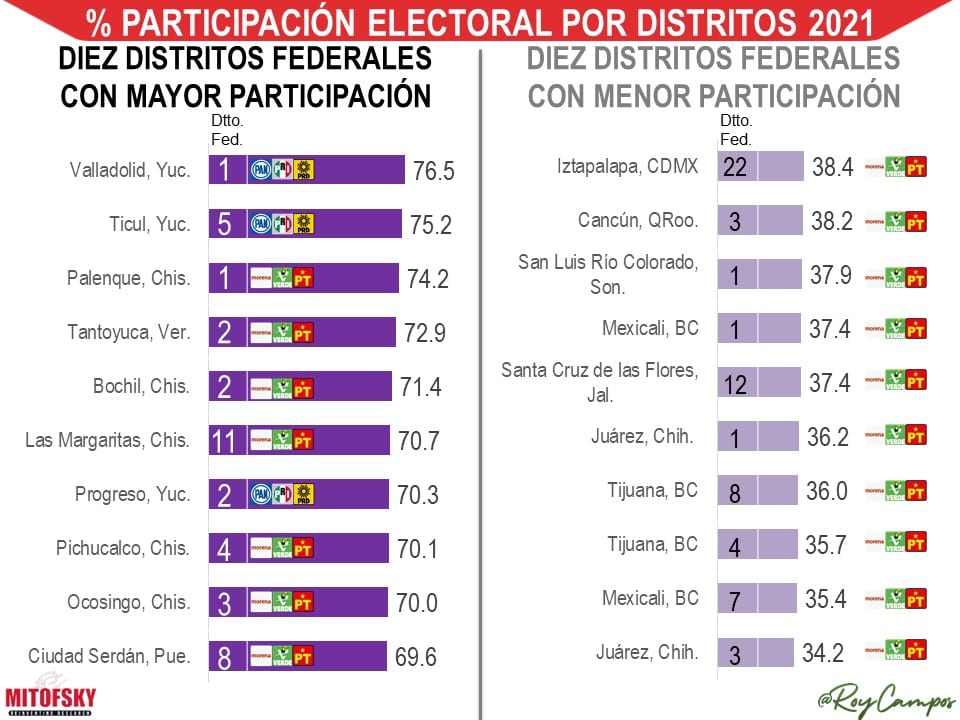 Anexamos los 10 distritos federales con mayor y con menor participación así como también el partido o coalición que triunfo en cada uno.