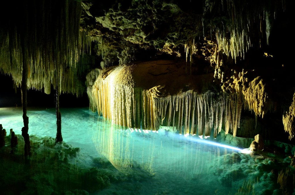 Estas increíbles cuevas inundadas y seminundadas por un río subterráneo cristalino se ubican a 25 metros bajo tierra donde un paisaje milenario, con estalactitas y estalagmitas gigantes y delicadas.