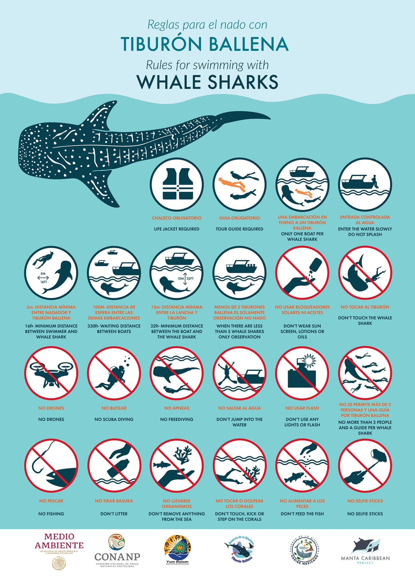 Si tienes la oportunidad de tener a uno o varios ejemplares de cerca, no se permite tocarlos,la distancia mínima para acercarse nadando es de cinco metros y diez metros en lancha, está prohibido retratarlos con flash en tomas fotográficas y al nadar cerca de ellos no debes usar bloqueadores o productos en la piel que no sea biodegradables.