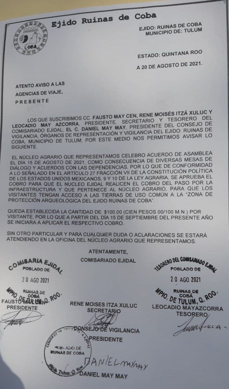 Desde esta fecha queda establecido dicho cobro e iniciará a partir del 15 de septiembre con la cantidad de 100 pesos moneda nacional por visitante, este cobro sin otro particular, además para cualquier duda o aclaración se estará atendiendo en la oficina del núcleo agrario, y firman Fausto May Cen, René Moisés Itzá y Leocadio May Azcorra, presidente, secretario y tesorero del Comisariado Ejidal, respectivamente, así como Daniel May, presidente del Consejo de Vigilancia del Ejido Ruinas de Cobá del municipio de Tulum.