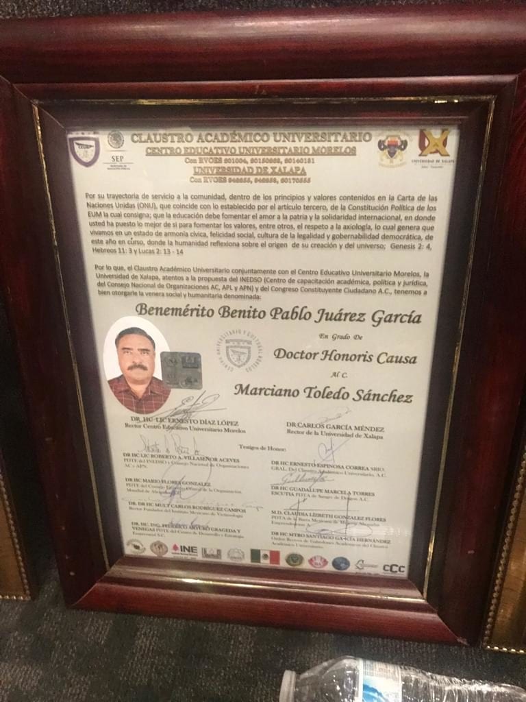 El luchador social Marciano “Chano” Toledo recibió el galardón “Benemérito Benito Pablo Juárez García” en grado de Doctorado Honoris Causa.
