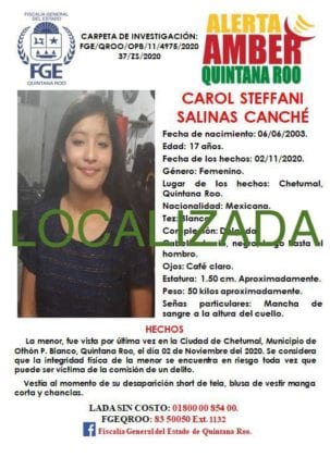 Desde el 02 de noviembre se integró la carpeta de investigación: FGE/QROO/OPB/11/4975/2020/37/ZS/2020, para localizar a Carol Steffani Salinas Canché de 17 años, reportada desaparecida en Chetumal. Vestía al momento de su desaparición short de tela, blusa de vestir manga corta y chanclas. Un día después la Fiscalía activó el “Protocolo Alba” para Carol Steffani Salinas Canché, la que se desactivó horas después, pues Carol fue localizada.
