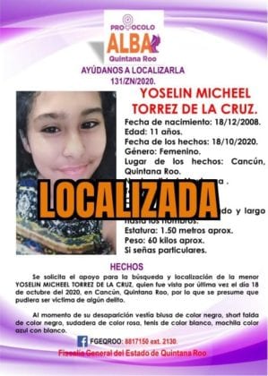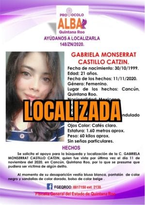 Por otro lado, se lanza el Protocolo Alba por Gabriela Montserrat Castillo Catzín, quien fue vista por última vez el 11 de noviembre de 2020 en Cancún; unas horas después, la FGE informa que Gabriela Montserrat Castillo Catzín fue localizada.