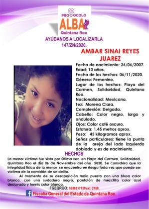 El miércoles 11 de noviembre, una Alerta Amber más por Jessica Alejandra Solís Martínez quien fue vista por última vez el 7 de noviembre de 2020 en Cancún. Así mismo se pide ayuda para localizar a Ambar Sinaí Reyes Juárez vista por última vez el 6 de noviembre en Solidaridad; también se emite Protocolo Alba por ser menor de edad. Ayer mismo, Yoselín Micheel Torrez de la Cruz fue localizada.