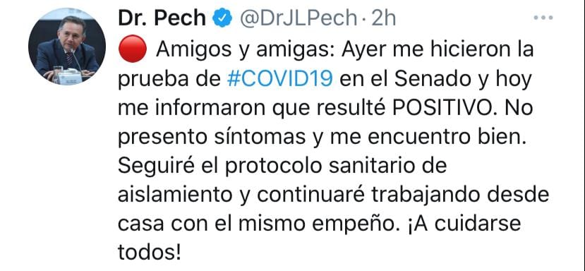 Pese a que el Dr. Pech tiene 66 años de edad y esto lo coloca dentro de los sectores de la población en riesgo, el senador ha asegurado que es asintomático, por lo que no ha requerido hospitalización y lleva su recuperación desde casa.