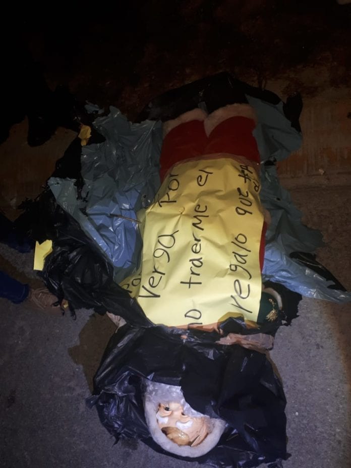 Playa del Carmen.- Un muñeco disfrazado de Santa Claus, dentro de una bolsa y acompañado de una cartulina, generó temor entre vecinos del fraccionamiento La Guadalupana, que pensaron que se trataba de un cuerpo ejecutado.