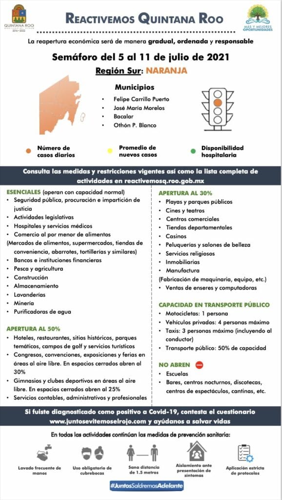 En la zona sur de Quintana Roo: Felipe Carrillo Muerto, José María Morelos, Bacalar y Othón P. Blanco, se mantiene el semáforo en color NARANJA