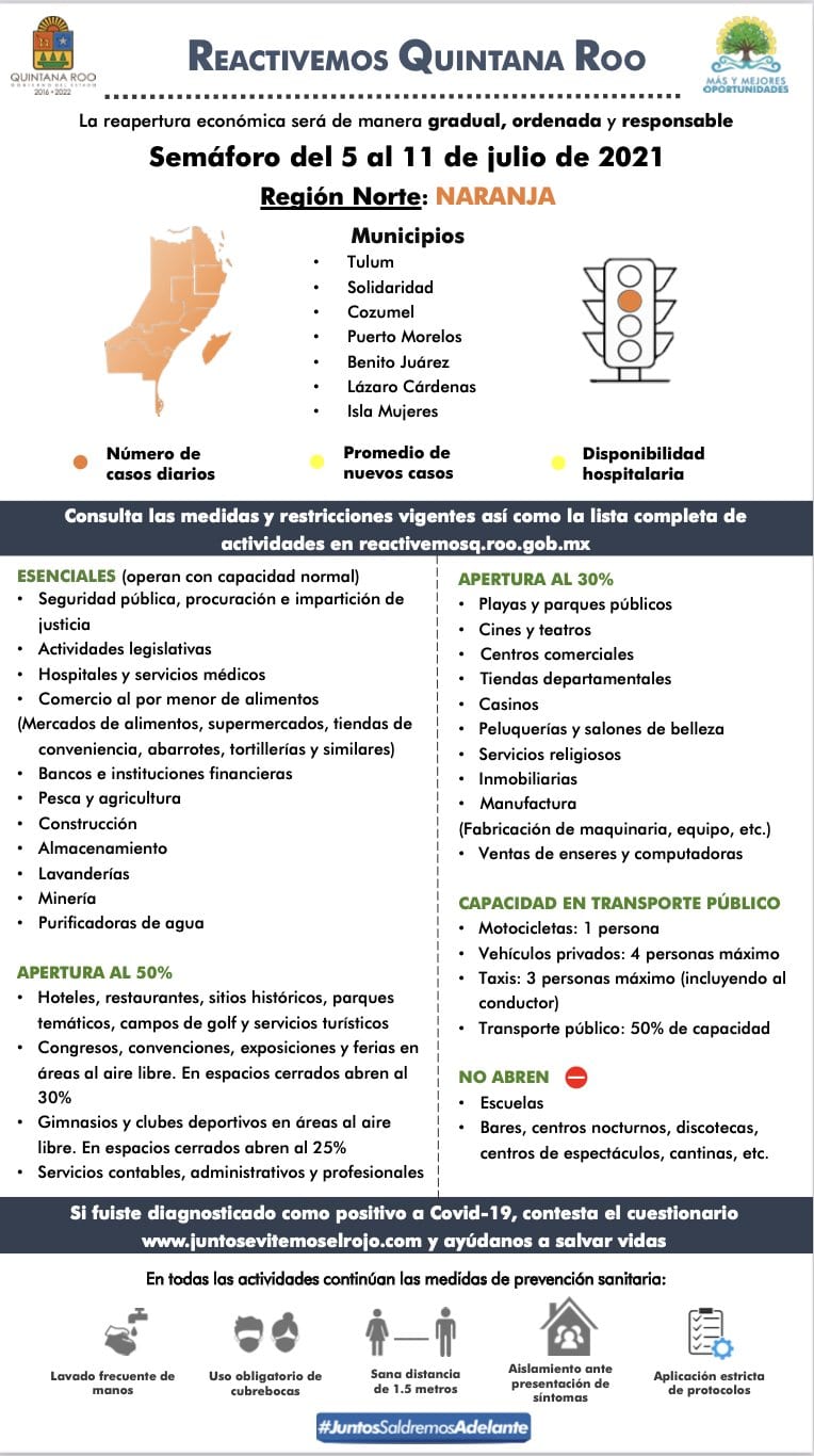 En la zona norte de Quintana Roo: Solidaridad, Benito Juárez, Cozumel, Puerto Morelos, Tulum, Isla Mujeres y Lázaro Cárdenas se mantiene en color NARANJA.