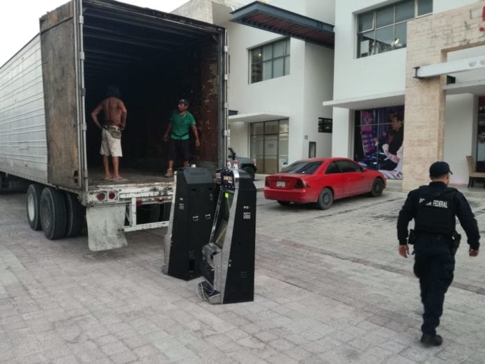 Playa del Carmen.- Con vigilancia por parte de la Policía Federal, esta tarde se realizó un embargo a la sucursal del Casino Red de esta ciudad, en la que se retiraron varias de las máquinas tragamonedas.