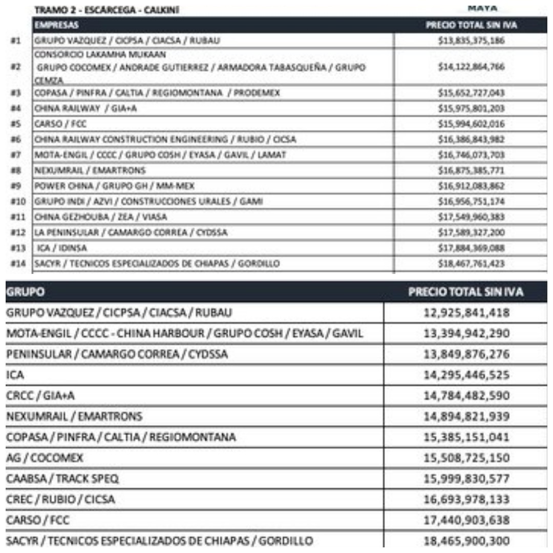 Agrega que la sombra de la corrupción se cierne sobre el tercer proyecto más importante del presidente Andrés Manuel López Obrador pues en la competencia por el tramo 1 y 2, el Consorcio conformado por Grupo Vázquez, Cicpsa, Ciacsa y Rubau se ubicó en primer lugar; mientras que el Consorcio conformado por Mota-Engil y Cccc-China Harbor se ubicó en segundo lugar en la competencia por el tramo 1 del Tren Maya, según “transparentó” el despacho del arquitecto Rogelio Jiménez Pons, encargado del proyecto.