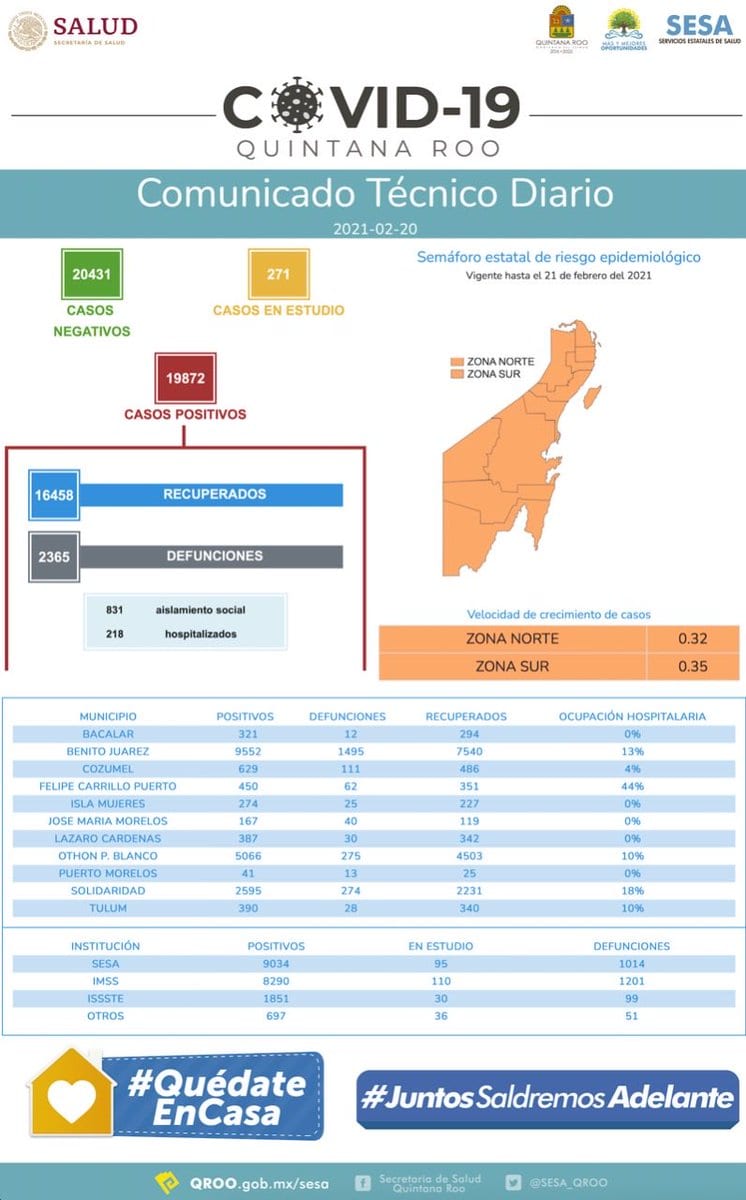 Mientas que la ocupación en los nosocomios es del 18% en el municipio de Solidaridad, 13% en Benito Juárez, 44% en Felipe Carrillo Puerto, 10% en Othón P. Blanco, y 10% en Tulum.