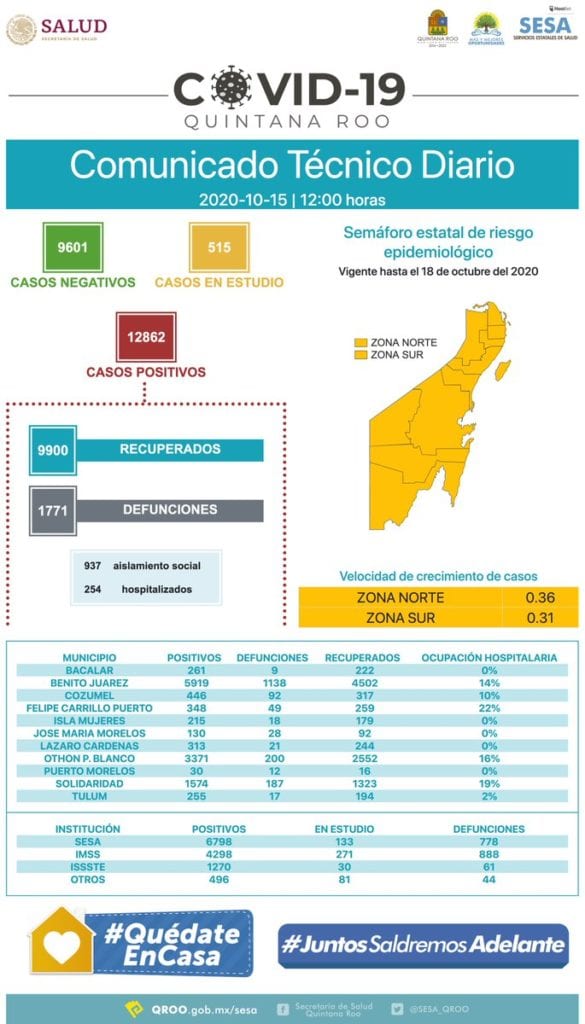 Hasta las 12 horas de este 15 de octubre, 12 mil 862 casos positivos y mil 771 defunciones relacionadas con Covid-19 en Quintana Roo.