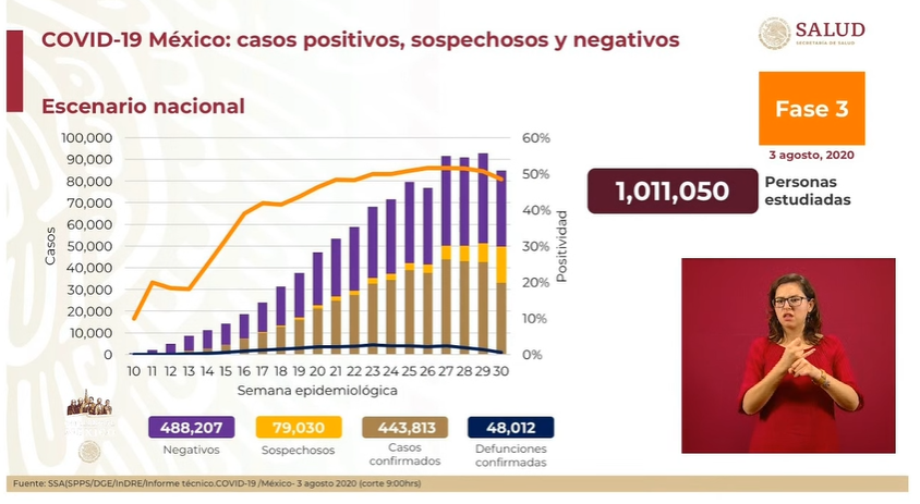 Esta tarde, la Secretaría de Salud informó que a 65 días de arrancada la nueva normalidad, la pandemia por coronavirus ha llegado a 443 mil 813 casos confirmados y 48 mil 12 defunciones.