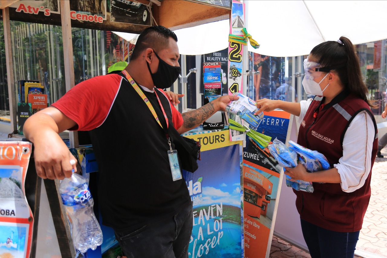 Playa del Carmen.- Continúa la entrega de kits sanitizantes a la población por parte del Ayuntamiento de Solidaridad en el marco de la campaña preventiva “Libre de Brotes”. En esta ocasión, se distribuyeron entre comerciantes y locatarios de la Quinta Avenida, para seguir incentivando la reactivación económica del municipio que actualmente cuenta con el 40% de las empresas reabiertas y una ocupación hotelera del 21.7% en la Riviera Maya, de acuerdo a la Secretaría de Turismo del estado.