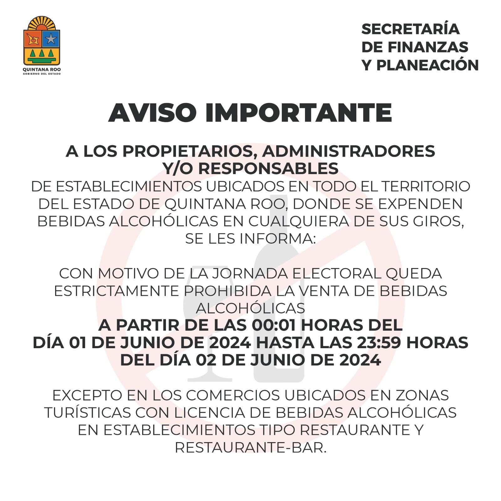 La Ley Seca comenzará en Quintana Roo desde el primer minuto del sábado 1 de junio. Así lo confirmó la Secretaría de Finanzas y Planeación (Sefiplan) del gobierno estatal que encabeza Mara Lezama Espinosa.
