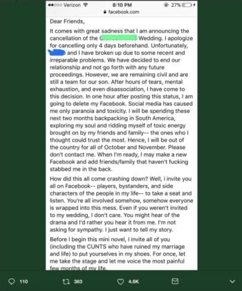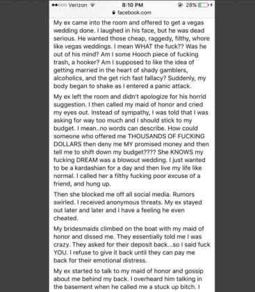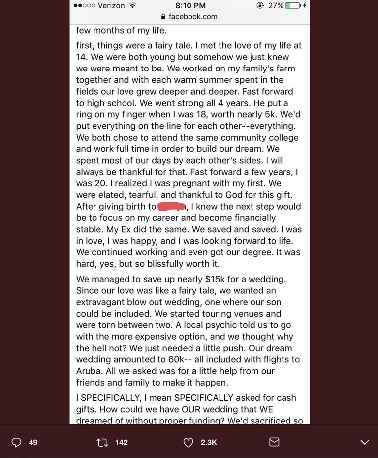 En su publicación, la mujer anónima inicia diciendo que ella y su pareja se separaron debido a “problemas recientes e irreparables”. Luego explica cómo se conocieron los dos a los 14 años, se enamoraron, se comprometieron a los 18 años con un anillo de 5 mil dólares, donde ellos tuvieron un hijo cuando tenían 20 años.