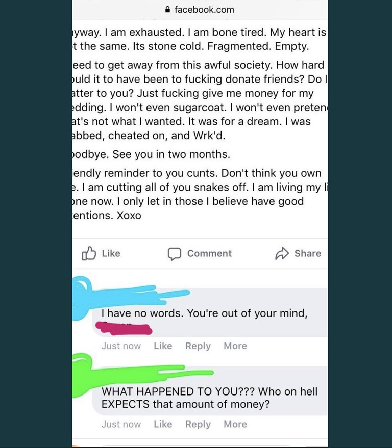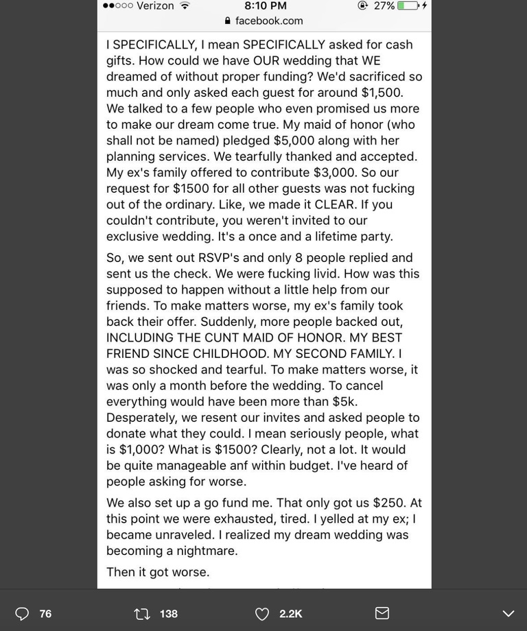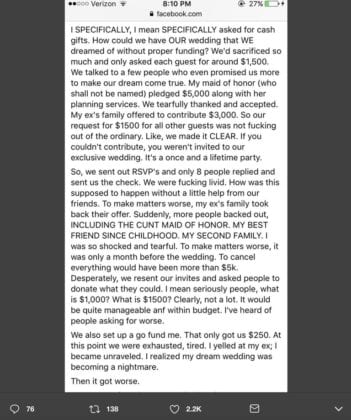 Lo mejor de todo es que cuando Susan, quien es originaria de Canadá se encargó de contar toda su historia al publicarla en Facebook y esto le ha valido que muchas personas le dejen claro que estaba loca al pensar que sus invitados le darían 1500 dólares por asistir a su boda.