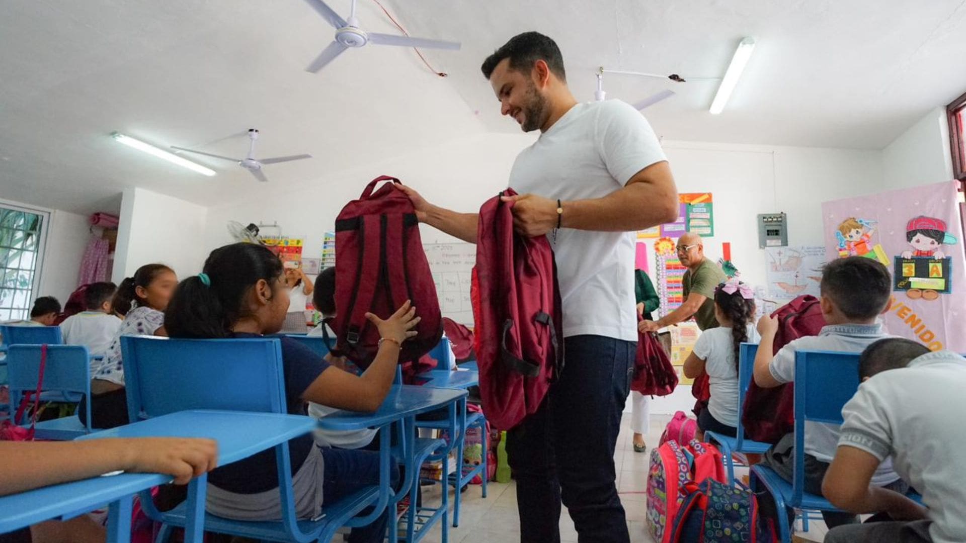 Después de recorrer salón por salón para entregar paquetes escolares gratuitos, Pablo Bustamante agradeció al equipo de la escuela primaria ubicaba en la Supermanzana 91, y a su directora, Juana Galera Chin, por su labor con la educación y el bienestar de niñas y niños cancunenses.