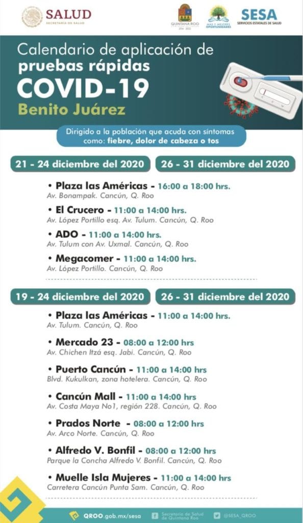 De acuerdo con el calendario de la Secretaría de Salud, del 19 al 31 de diciembre, a excepción del día 25, habrá puestos colocados en Plaza las Américas, Cancún Mall, Puerto Cancún, Muelle de Isla Mujeres, El Crucero, terminal ADO y la Megacomer de la Av. López Portillo, con horario de atención de 11:00 a 14:00 horas, así como en el Mercado 23, fraccionamiento Prado Norte y parque La Concha en la delegación Alfredo V. Bonfil, de 8:00 a 12:00 horas.