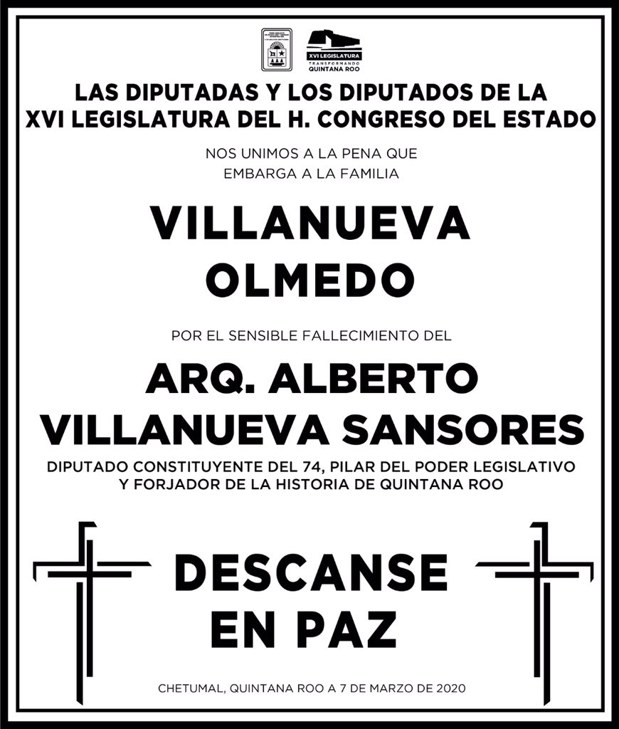 Chetumal.- Las diputadas y diputados de la XVI Legislatura lamentan el sensible fallecimiento del Arq. Alberto Villanueva Sansores, Diputado Constituyente de 1974, pilar del Poder Legislativo y un hombre que forjó la historia del Estado de Quintana Roo, reza un Twitter del Congreso del Estado con el que se anuncia la muerte del ilustre quintanarroense.