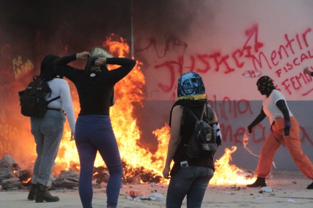 Cancún.- Grupos de feministas que se manifestaron esta tarde afuera de la Fiscalía General del Estado (FGE) en Cancún, prendieron fuego a la entrada principal del inmueble sin que se tengan reportes de daños ni de personas detenidas.