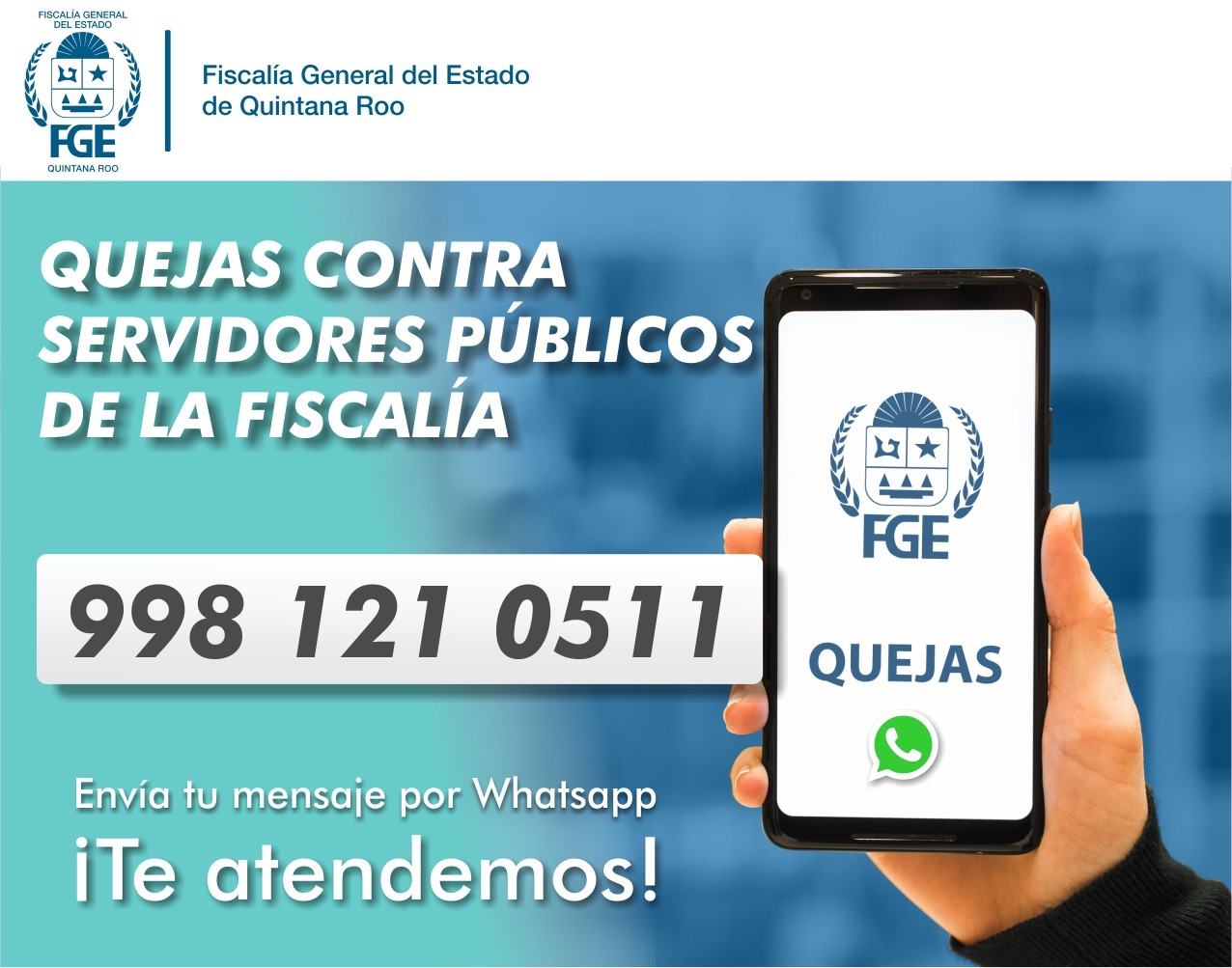 Asimismo, la FGE Quintana Roo pone en operación el número 998 121 05 11 para que la ciudadanía interponga quejas y denuncias en contra de servidores públicos de la institución, que realicen alguna omisión para iniciar o recabar denuncias, dilación de expedientes o trato indigno hacia los usuarios.