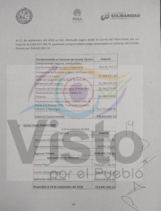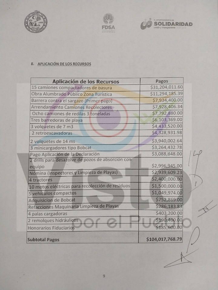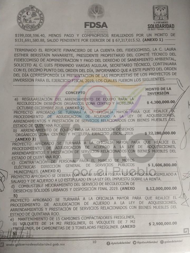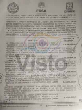 En los documentos, obtenido a través de transparencia por la Asociación Civil “Visto por el Pueblo”, pormenoriza los gastos emprendidos por la administración municipal anterior, que incluye la renta de 15 camiones de basura, por 31 millones de pesos; un proyecto de alumbrado para Playa del Carmen, por 11 millones de pesos; una barrera antisargazo (la instalada por Dakatso, posteriormente retirada) y la renta de diverso equipo para la limpieza de playas, por casi 50 millones de pesos en total.