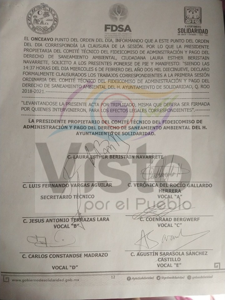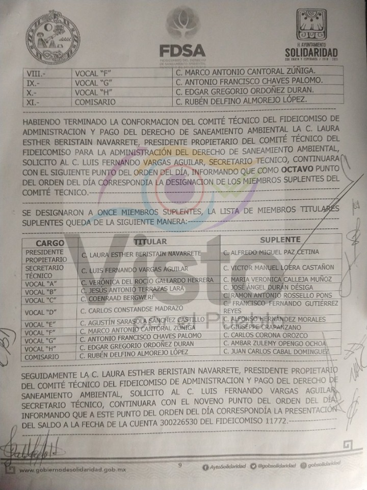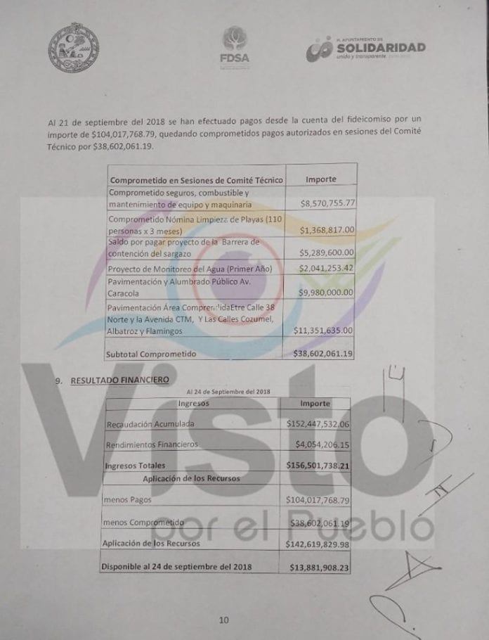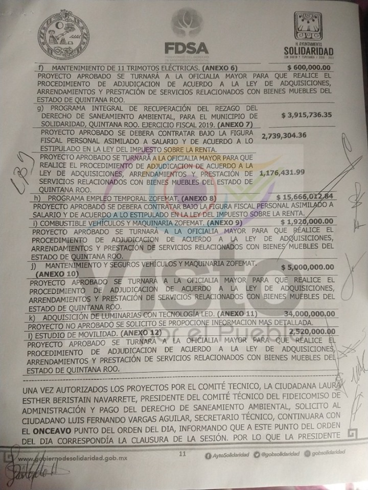 También se incluyen los proyectos sometidos a consideración y aprobados por el nuevo comité, en la actual administración, lo que incluye la renta de equipo de limpieza para la zona turística, por cerca de 26 millones de pesos, combustible para los camiones recolectores de residuos, por 12 millones de pesos, un programa de empleo temporal (para recolecta de sargazo) por 15.6 millones de pesos, y la compra de luminarias para 34 millones.