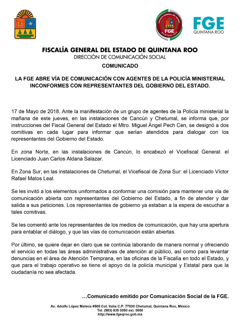 Chetumal.- Horas después de que el gobernador, Carlos Joaquín González, dijo que su administración estaría atenta para conocer y escuchar las propuestas de los agentes ministeriales, la Fiscalía General de Estado emitió un comunicado en el que informa que abrieron vías de comunicación entre inconformes y representantes del Gobierno del Estado.