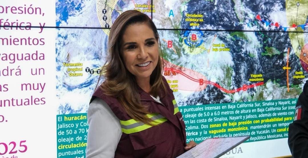 La gobernadora Mara Lezama Espinosa realizó una visita de supervisión al Puesto de Mando instalado como parte del seguimiento a una zona de baja presión que se desplaza sobre la Península de Yucatán e interactúa con un canal de baja presión.
