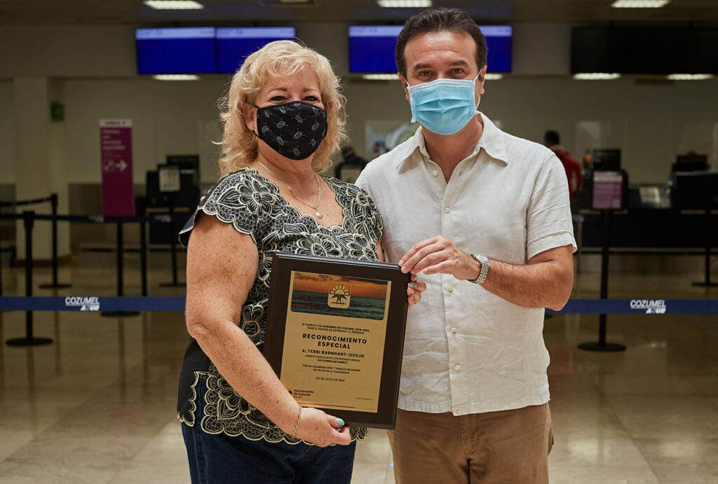 Cozumel, Quintana Roo.- El Presidente Municipal, Pedro Joaquín Delbouis, hizo entrega de un reconocimiento especial a Terry Barnhart Ocejo, Agente Consular de los Estados Unidos en Cozumel, por su entrega y compromiso con la isla, su comunidad y la atención a los turistas extranjeros.