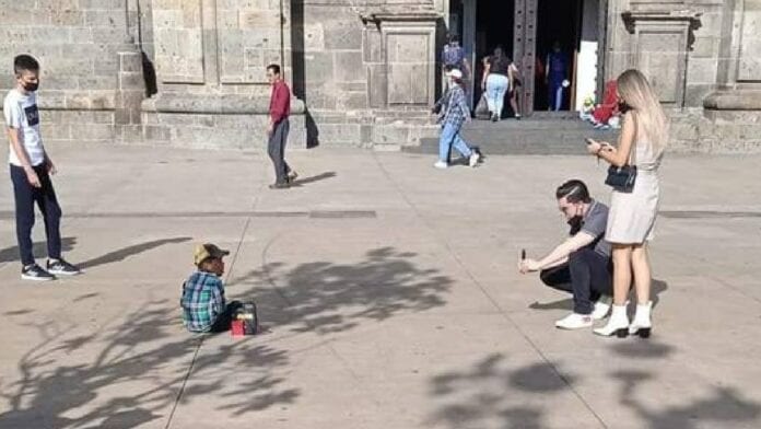 México.- En redes sociales exhibieron a una pareja que fotografió a un niño n Guadalajara pidiendo limosna, lo cual consideraron un acto de racismo.