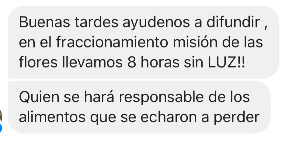 Playa del Carmen.- Desde anoche, vecinos del fraccionamiento Misión de las Flores están sin electricidad, temiendo ahora perder sus productos perecibles, en momentos de extrema necesidad económica. Por fortuna y tras casi unj día con afectaciones, la luz volvió a dicha zona residencial.