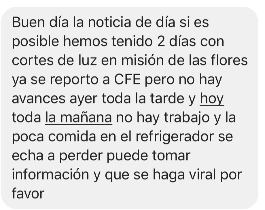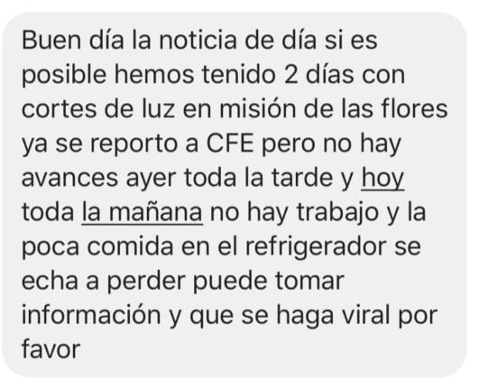 Cabe resaltar que además mediante denuncias en redes sociales, algunas personas de Playa del Carmen también han hecho del conocimiento los problemas en el suministro de energía. Y es que dicen, aunque la CFE ya está enterado de poco ha servido. Por lo que esperan que sus denuncias en redes hagan un poco más de presión.