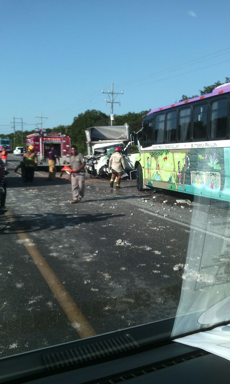 Playa del Carmen.- Playa del Carmen.- Un camión de la empresa Xcaret se estrelló de frente con un volquete, en la carretera federal, a la altura de Calica, con saldo de 18 heridos, a eso de las ocho de la mañana de hoy.