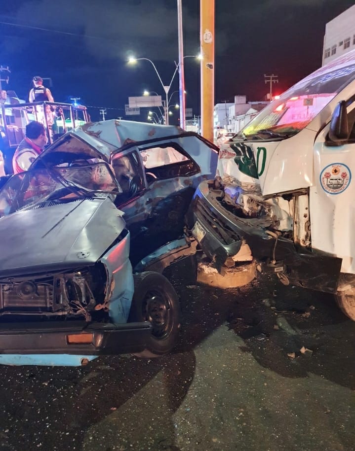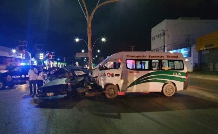 Cancún.- Un choque entre una combi de transporte público y un auto tipo Gol, marca Volkswagen, dejó un saldo de dos personas lesionadas la mañana de este miércoles.
