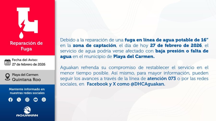 Aguakan continuará informando oportunamente sobre los avances y notificará en cuanto concluyan las labores de reparación en Playa del Carmen.