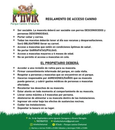 Si bien el sitio garantiza que los animales podrán estar tranquilos, los dueños le recuerdan a los propietarios que deben estar atentos de sus canes y no dejarlos solos. Además vale recalcar que existe un reglamento para quienes acudan al parque, el cual ponemos a continuación.