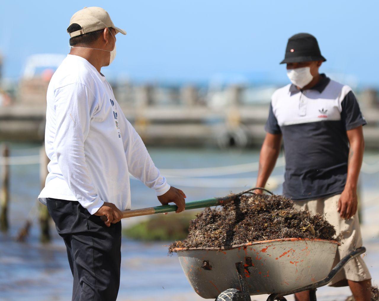 Puerto Morelos.- El gobierno de la presidenta municipal Laura Fernández Piña atiende los primeros arribos de sargazo a la costa portomorelense, con una cuadrilla de trabajadores municipales que todos los días, pese a la emergencia sanitaria por la pandemia de Covid-19, acuden para retirar la macroalga respetando los protocolos de prevención como el uso de cubrebocas y la sana distancia.