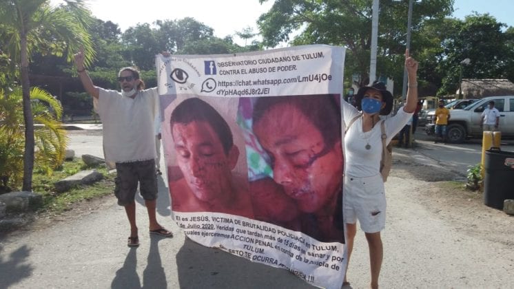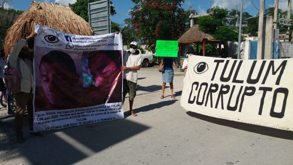 No muy lejos de ahí, otro grupo llevaba una manta con la leyenda “Tulum corrupto” y otra lona en donde se detalla el supuesto abuso policiaco cometido contra un ciudadano, en junio de este año. Se trata del recién creado “Observatorio Ciudadano”, iniciado por víctimas de abuso policiaco.