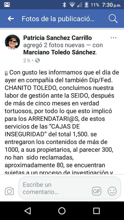 Cancún.- Con la devolución del contenido de mil de las mil 500 cajas de seguridad de la empresa First National Security, los diputados federales Patricia Sánchez Carrillo (PAN) y José Luis “Chanito” Toledo Medina (independiente) concluyeron sus gestiones ante la SEIDO.