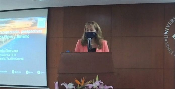 Cancún.- Gloria Guevara Manzo, presidenta y CEO del Consejo Mundial de Viajes y Turismo (WTTC, por sus siglas en inglés), dijo que para salir más pronto de la crisis es necesario, primero, aprender a coexistir con el Covid-19, el reforzamiento constante y unificado de los protocolos sanitarios y establecer programas que permitan ayudar a mejorar las agendas en temas digitales y de sustentabilidad.