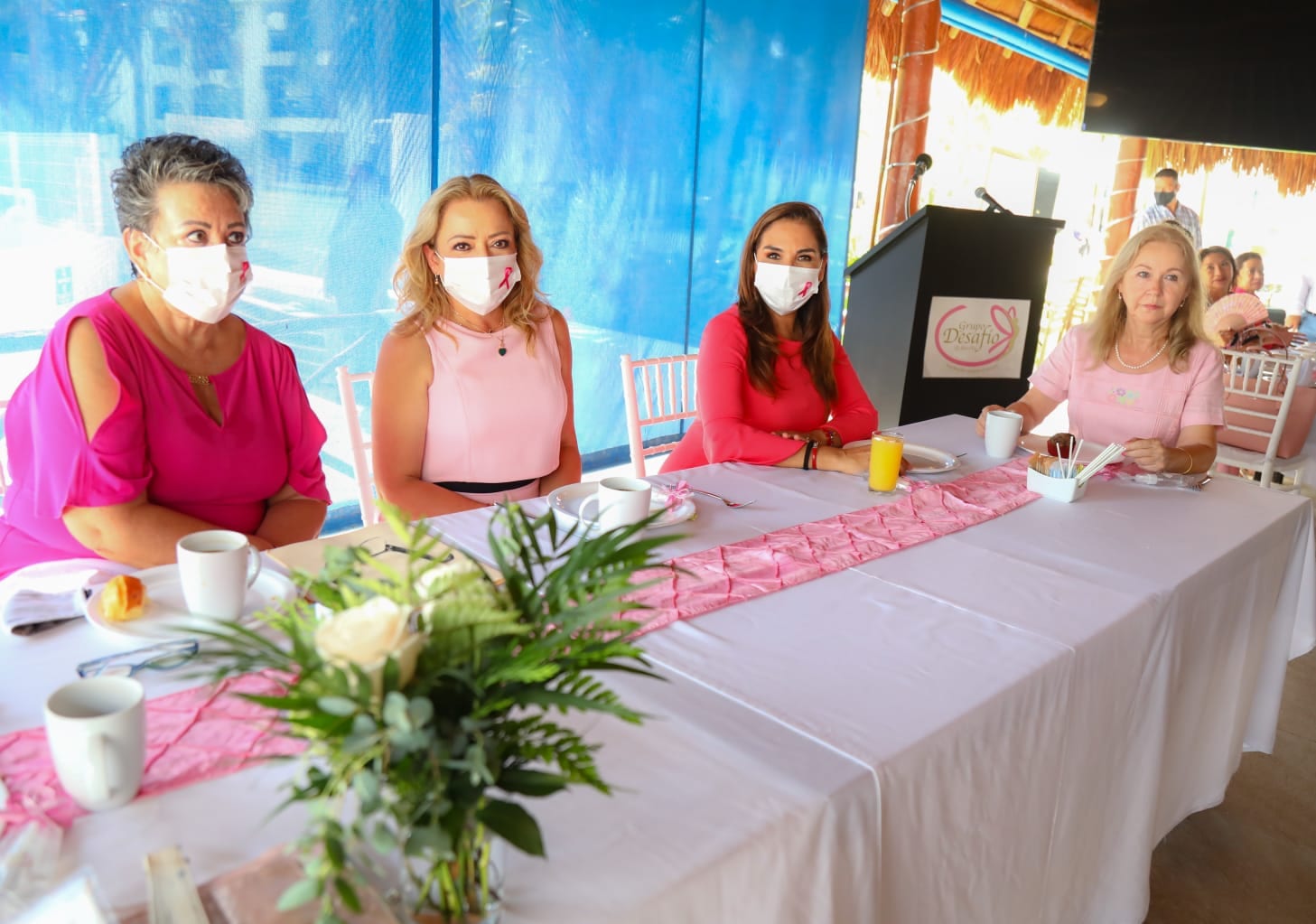 Junto con la presidenta honoraria del Sistema DIF Quintana Roo, Gabriela Rejón de Joaquín, la Presidenta Municipal Mara Lezama, acudió al “Desayuno Rosa” y reconoció la ardua labor de la titular de Grupo Desafío, Yolanda Hernández, para apoyar a las mujeres con orientación y actividades preventivas en torno a esa enfermedad.