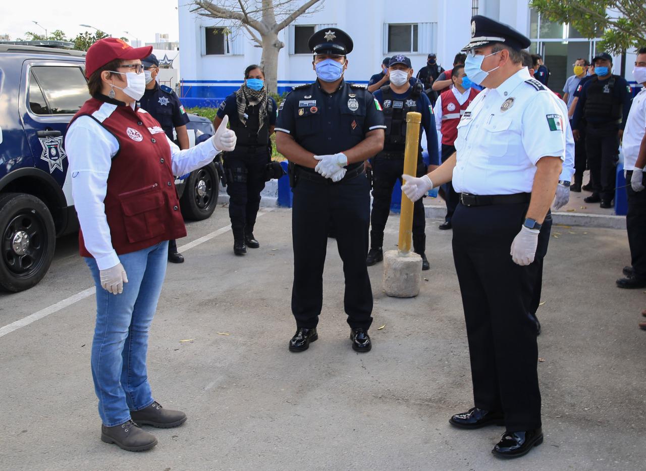 Playa del Carmen, Quintana Roo.-La presidente municipal de Solidaridad, Laura Berastain Navarrete, reconoció el esfuerzo y dedicación que han mostrado las y los elementos de la Secretaría de Seguridad Pública y Tránsito Municipal a cargo del comandante Jorge Robles Aguilar, ante el reto que ha representado la contingencia sanitaria del virus COVID-19, por lo que refrendó su compromiso de seguir mejorando sus condiciones laborales, equipamiento y capacitación para tener mejores policías que cuenten con las herramientas para el desempeño de su trabajo diario.