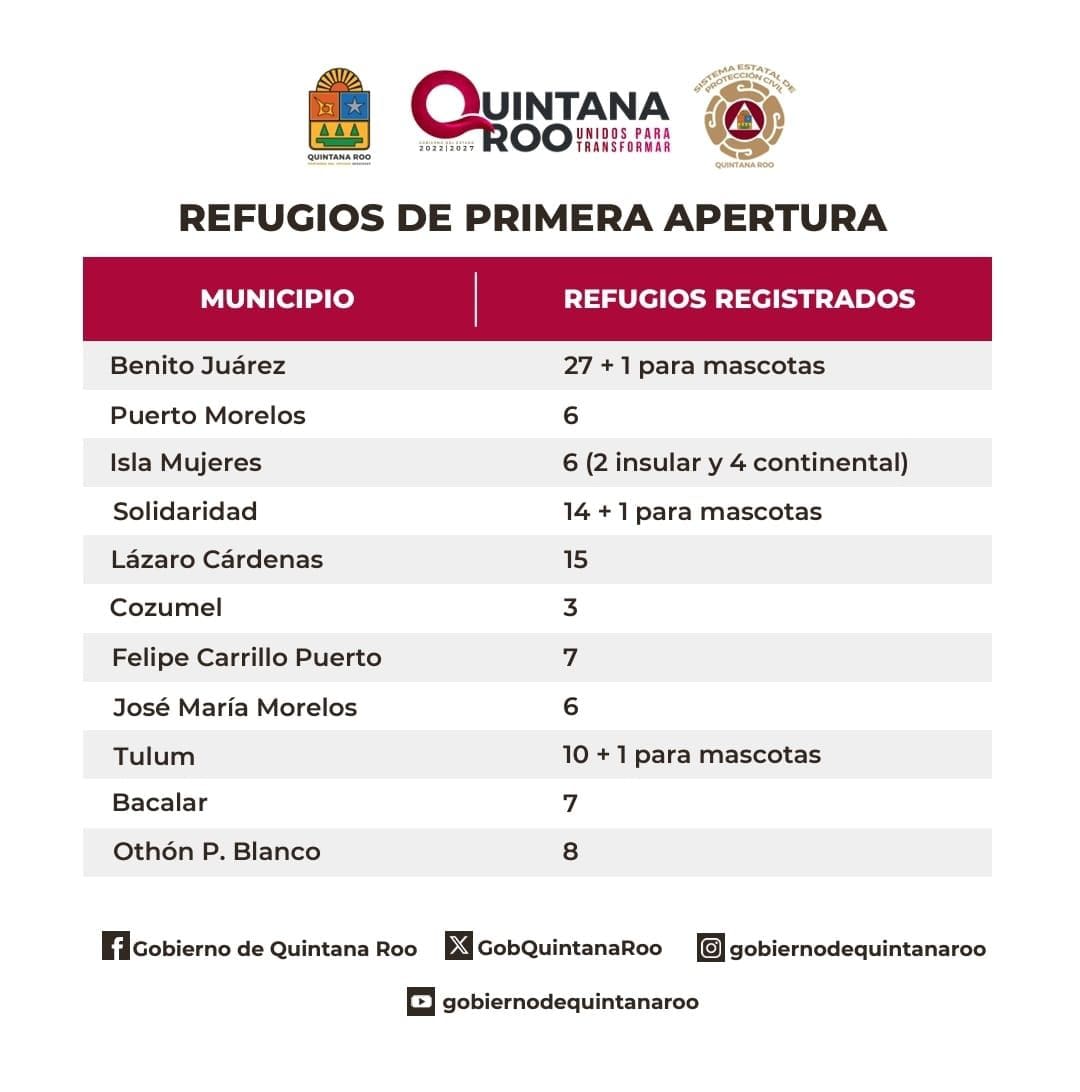 Para conocer la ubicación de los demás refugios se puede consultar el siguiente link: https://qroo.gob.mx/coeproc/index.php/refugios/.