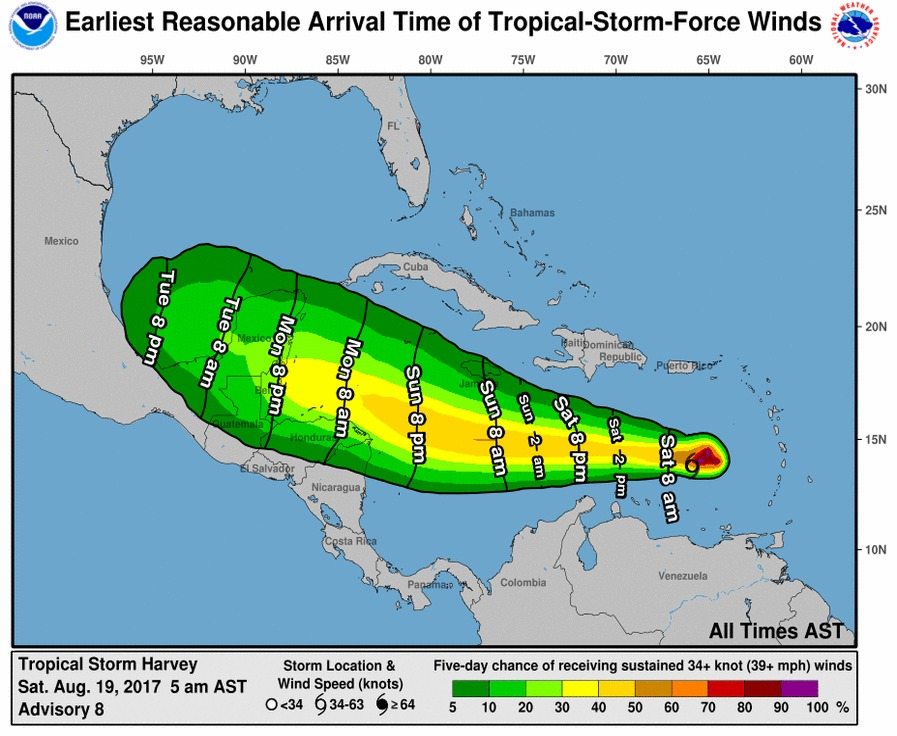La Tormenta Tropical Harvey del Mar Caribe; se localizó la mañana de hoy a las 05:00 hrs; en las coordenadas 13.8 grados latitud norte y 65.9 grados longitud oeste.
