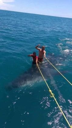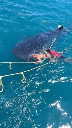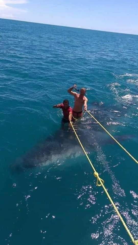 Se ignora qué empresa o cooperativa es la que llevó a estos turistas, pero evidentemente es cómplice, pues los visitantes se auxilian de sogas para mantenerse sobre el pez y sonríen alegremente para la cámara, imagen seguramente tomada por los touroperadores.